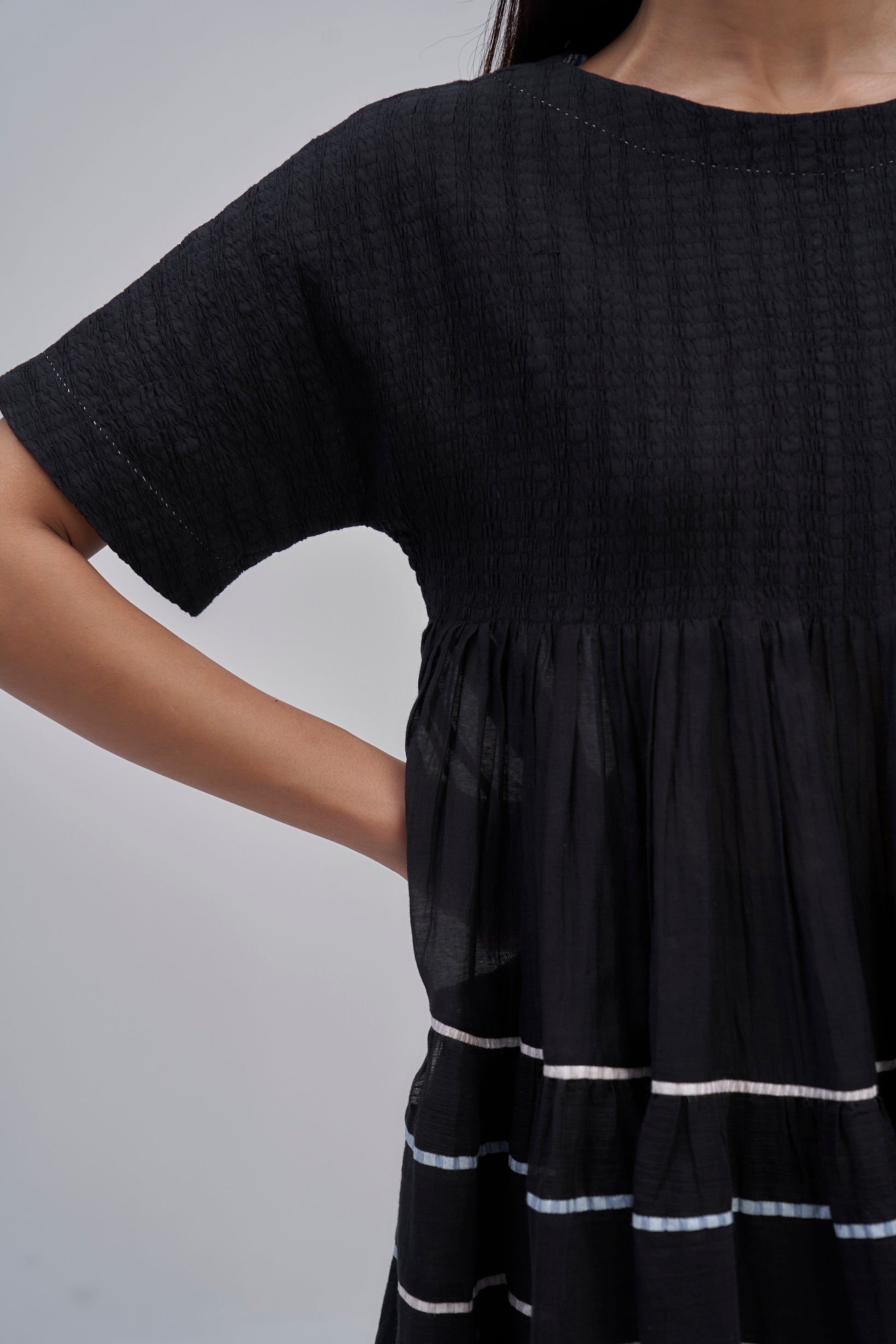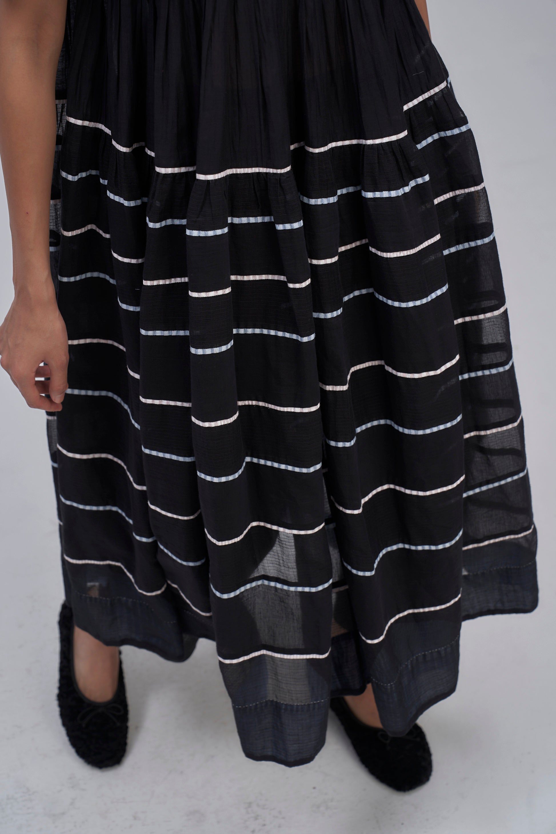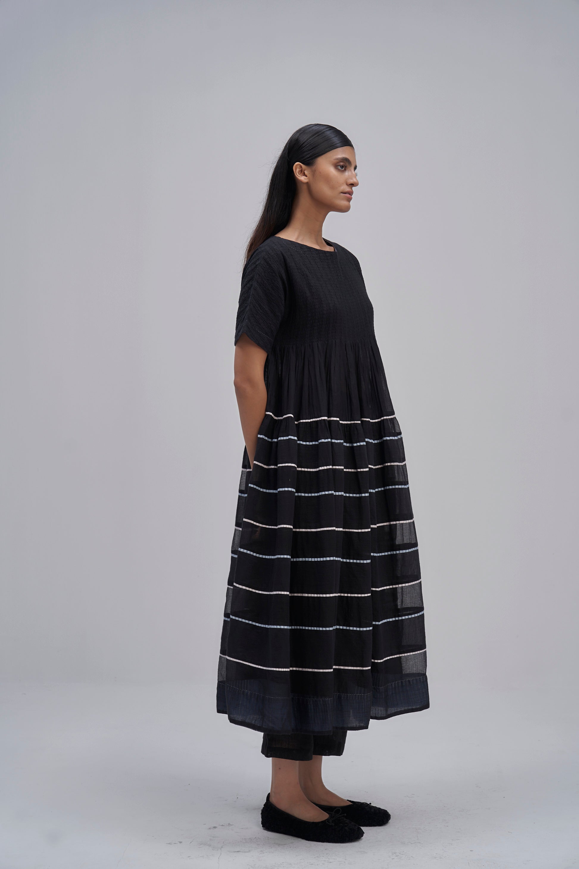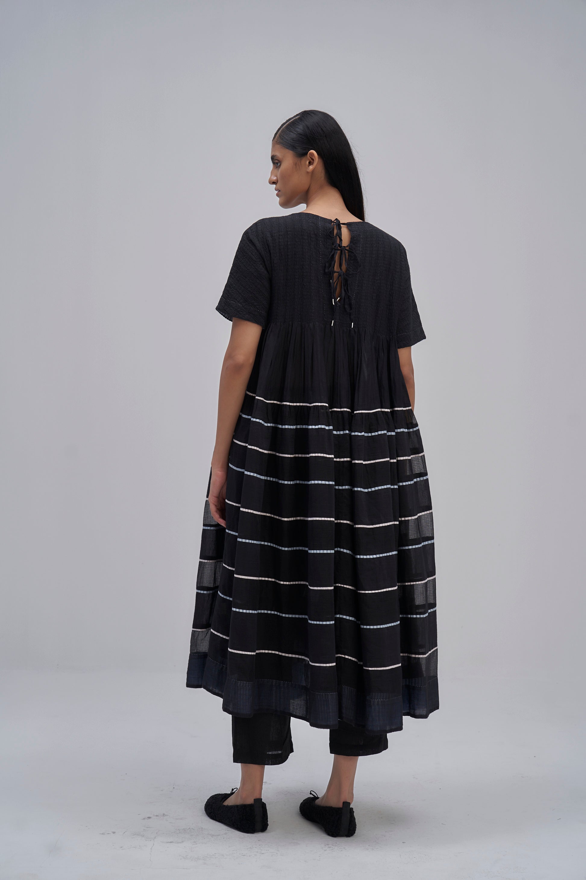 Panelled maxi relaxed fit dress with ruching detail on bodice and tye up opening detail at the back. Constructed in patchwork of solid cotton silk blend and kota doriya fabric. Finished with contrast striper handblock print piping and contrast handblock print facing detail.