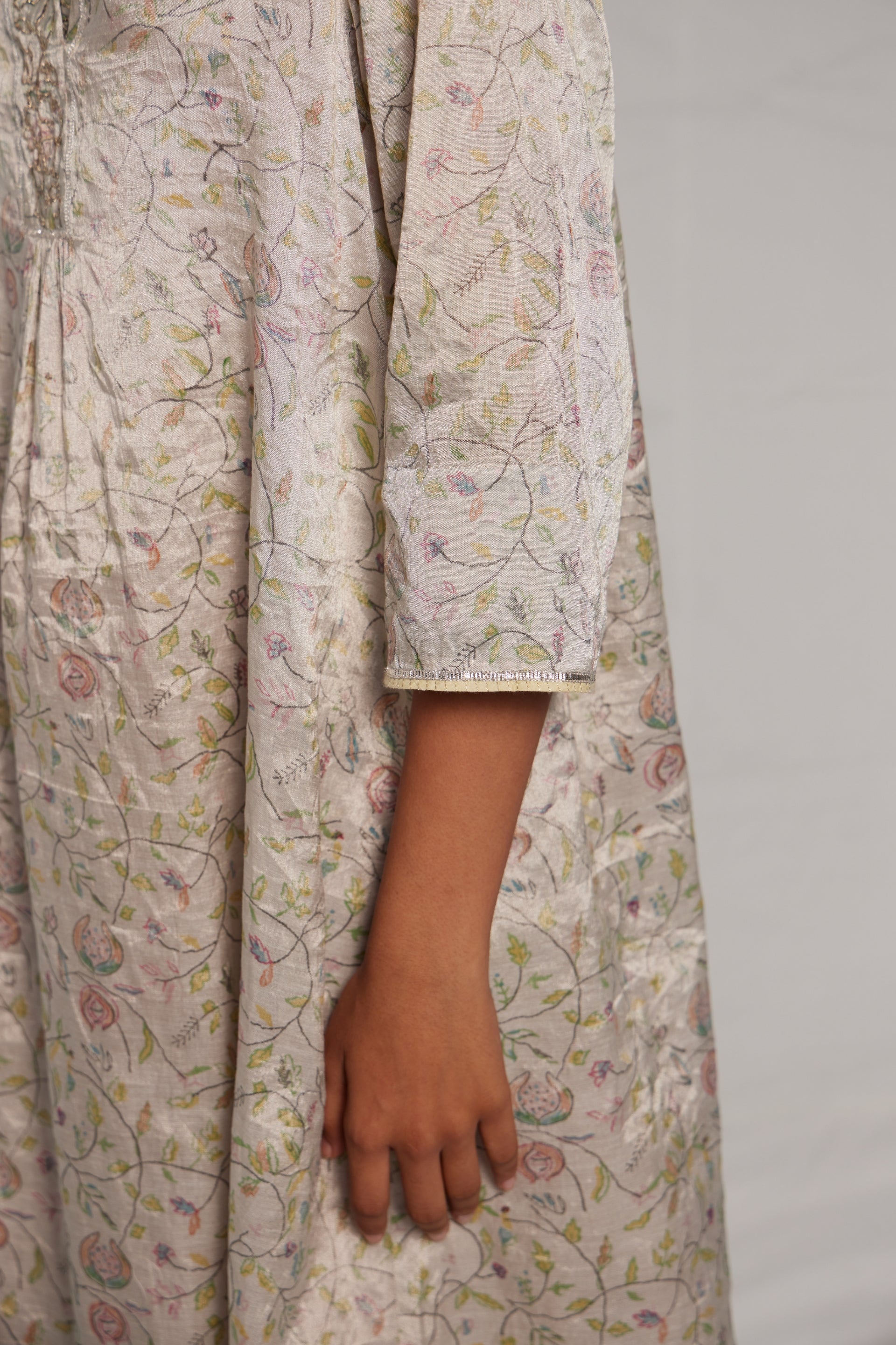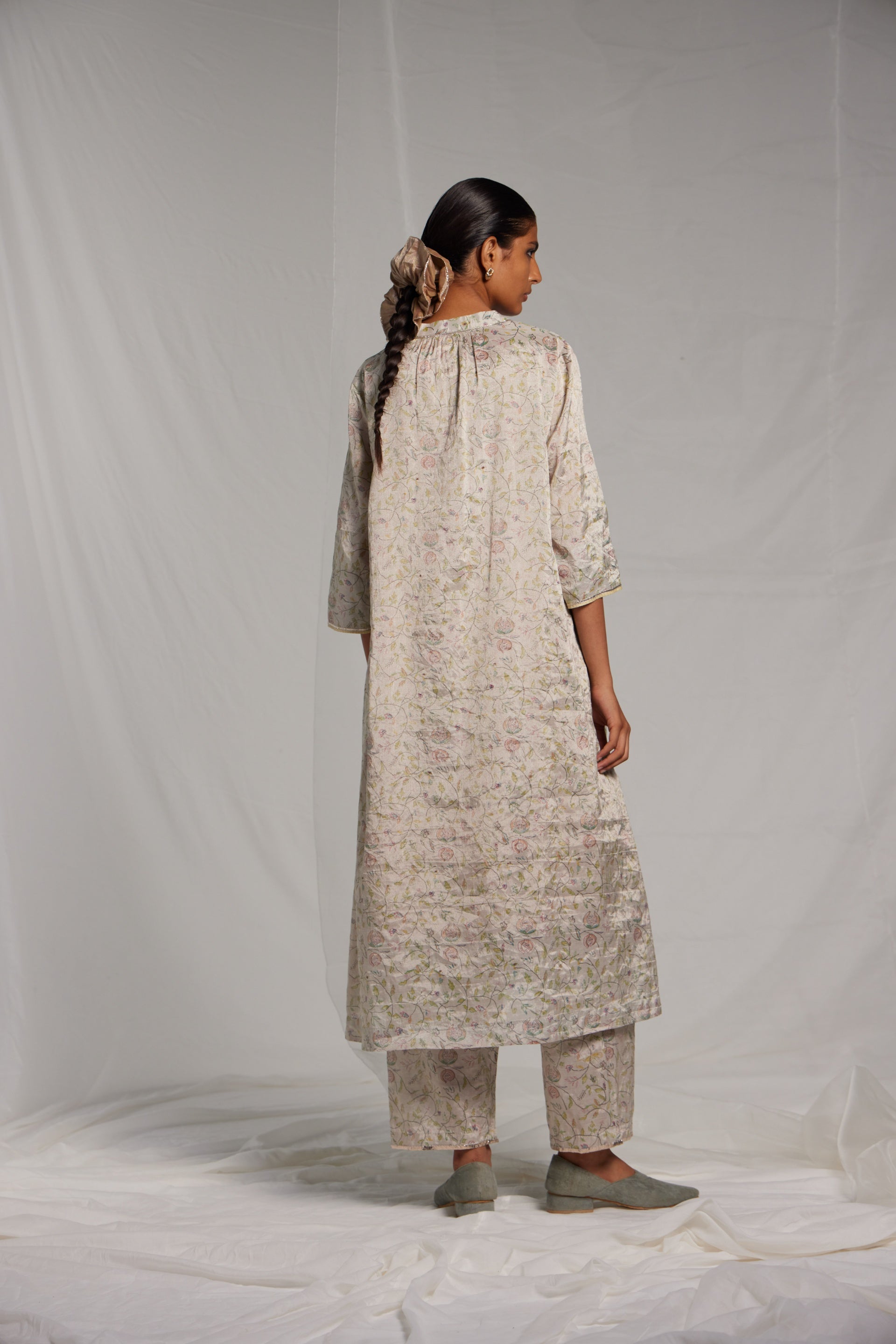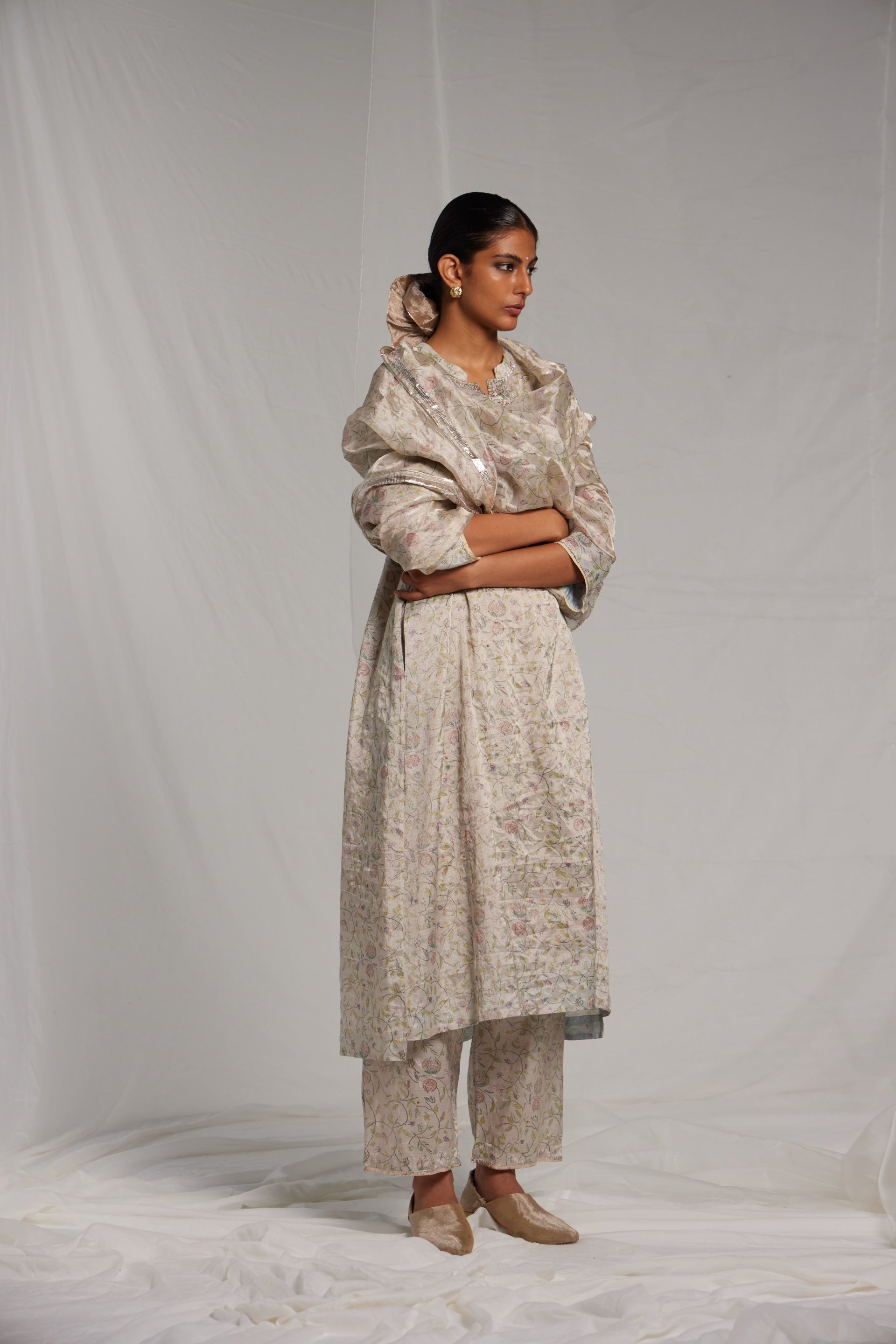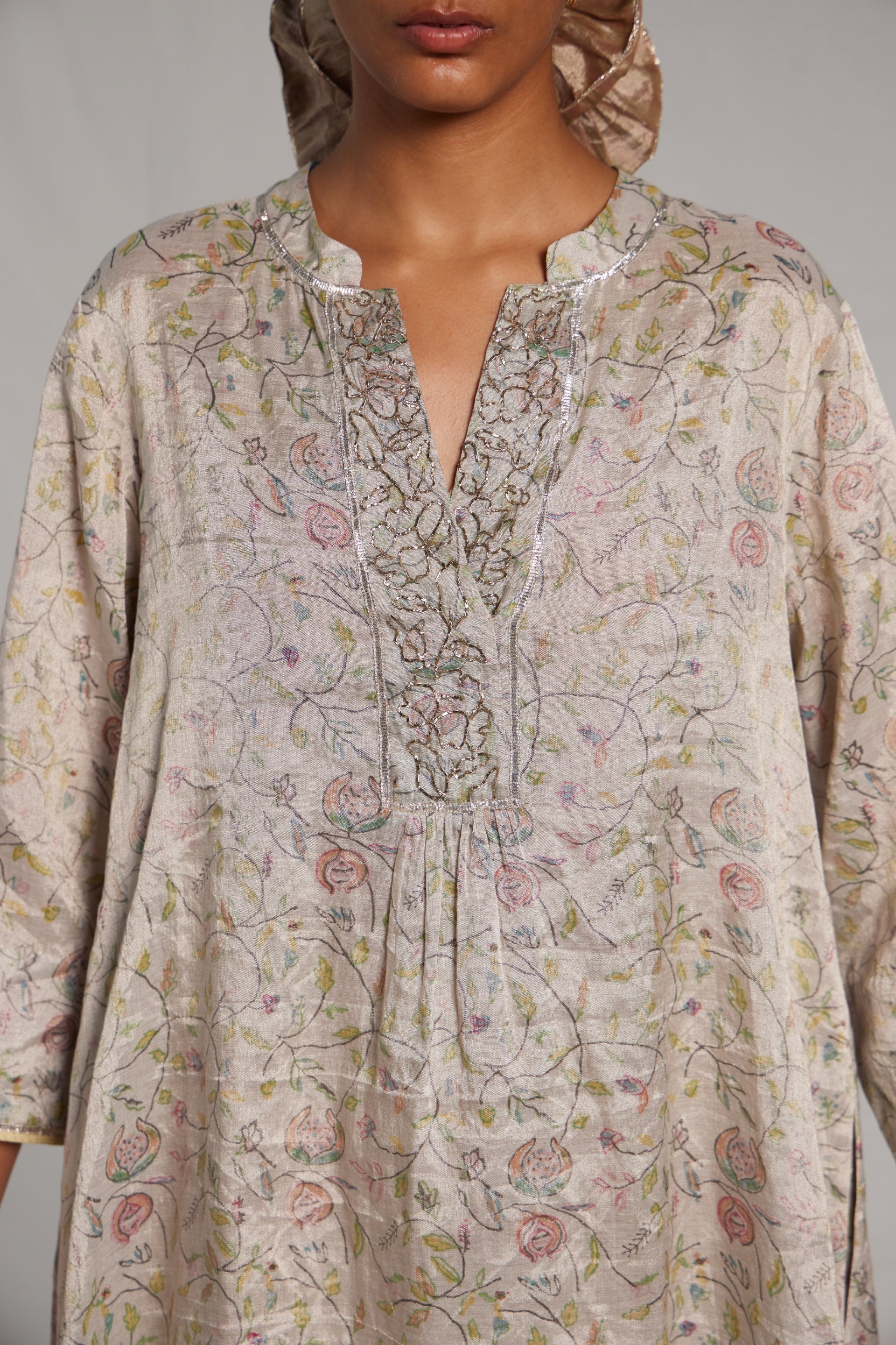 All over hand block printed a-line semi fitted, mid length kurta dress in linen zari tissue with hand pitta embroidery on the placket, finished with metallic gota on hemline, sleeves and collar. Comes along with a pair of straight fit linen zari hand block printed pants, finished with metallic gota seam detail on the hem.