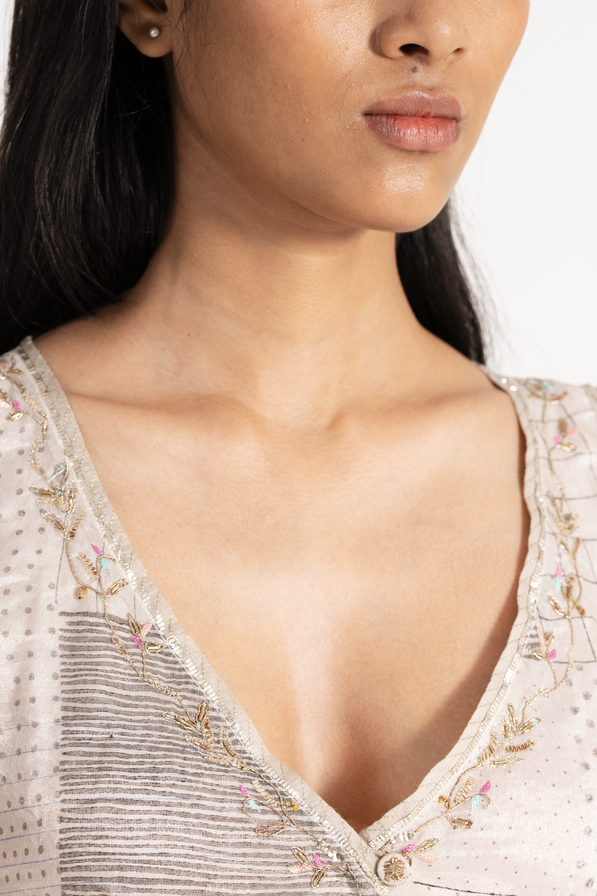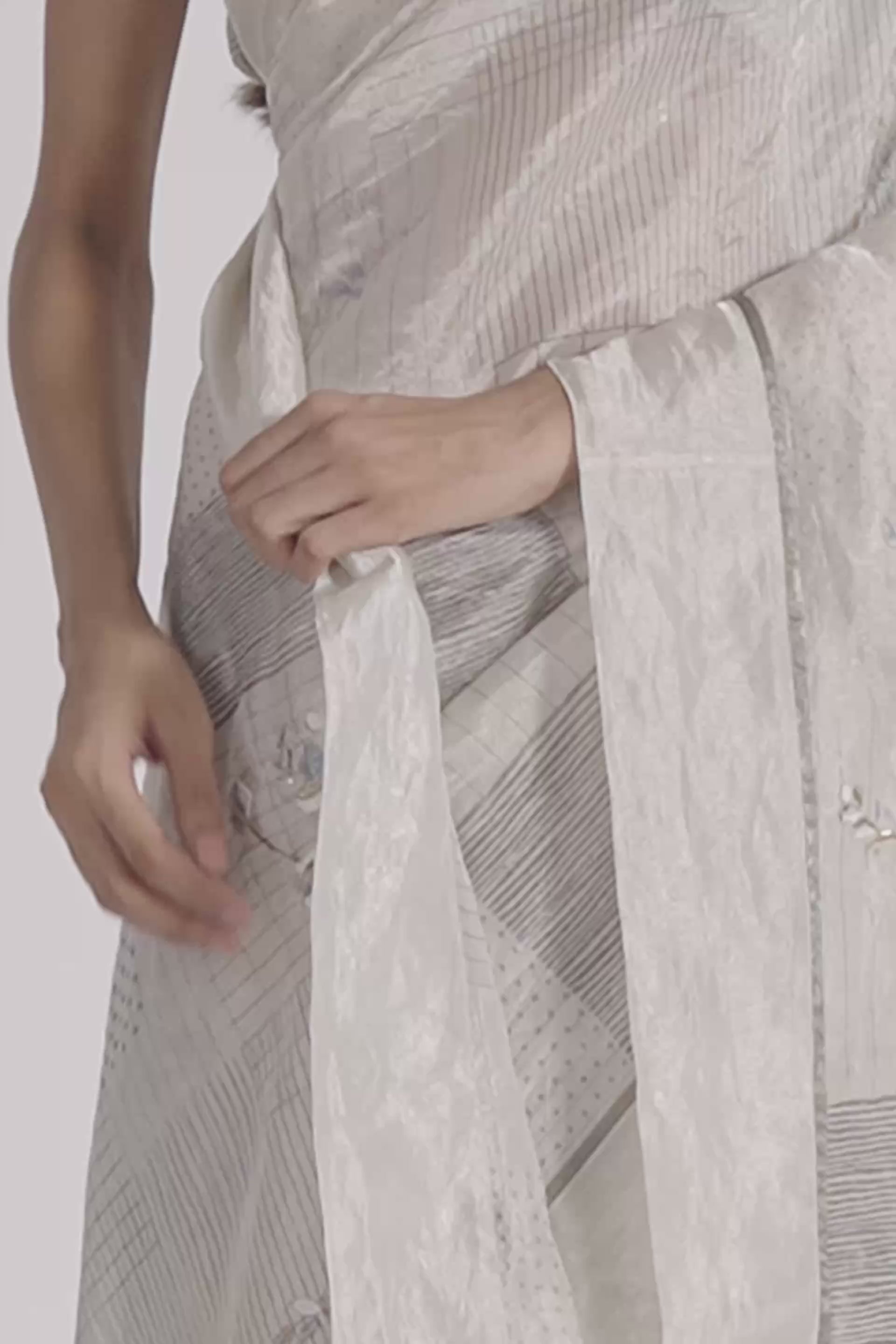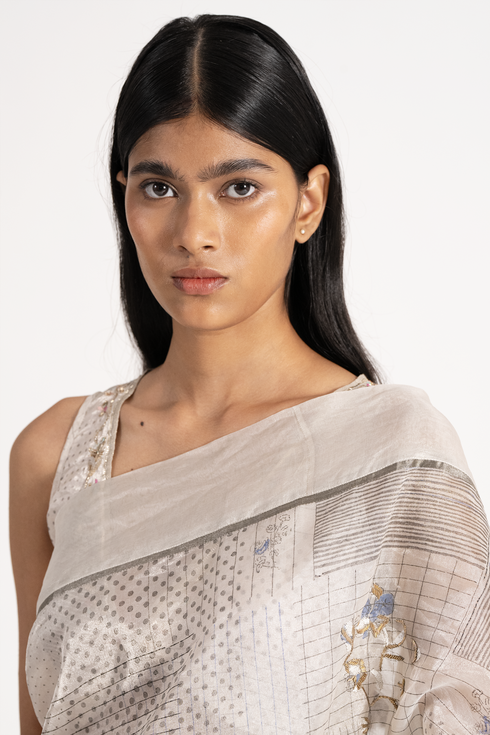 Patchwork Saree With Hand Embroidery And Gota Placement On It In Organza Tissue.