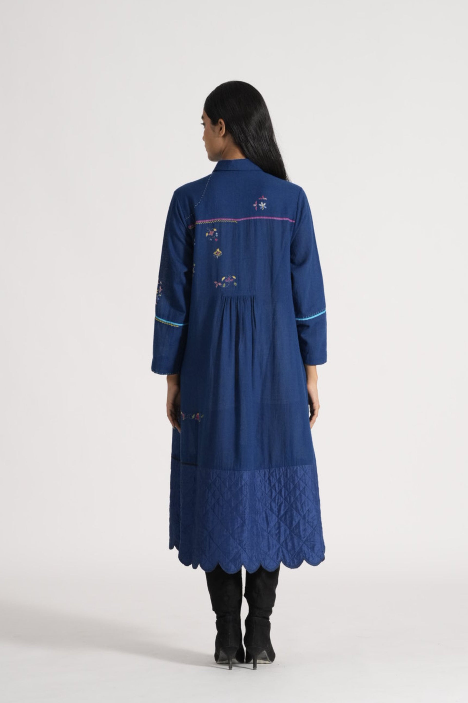Button Down Dress In Multicolor And Delicate Hand Stitch Details And Placement Hand Embroidery In 100% Merino Wool With Quilted Silk At Hem And Yoke