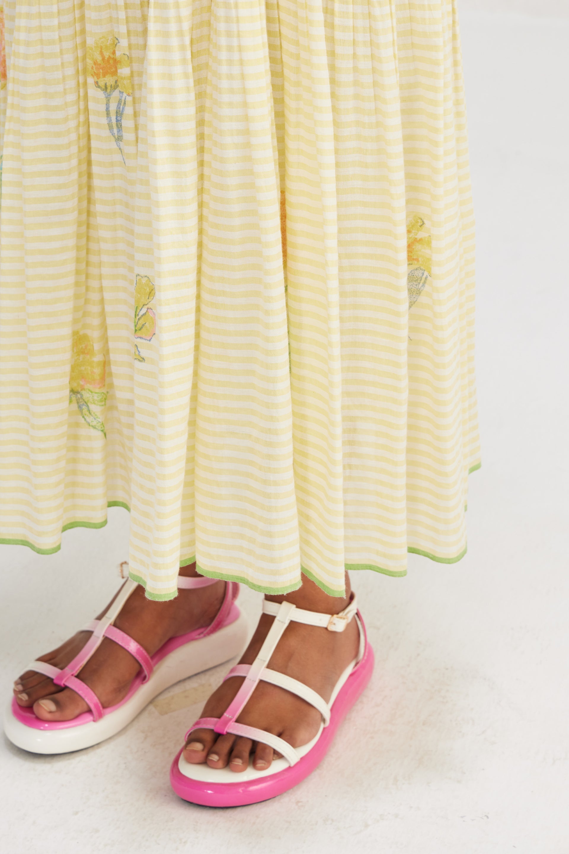 Sleeveless spaghetti strap dress in striper mix and multicolor placement chunky floral hand block print pattern. From the hand-woven cotton to the intricately block-printed florals, every element is crafted with precision and care. With ruffle detail on the neckline, the dress consist of 5 floral hand block printed placement, where 3-4 blocks are used to complete the pattern. Hand-woven cotton tiered dress with patchwork with selvedge detail on the hem. Comes with an attached hand block text printed lining.