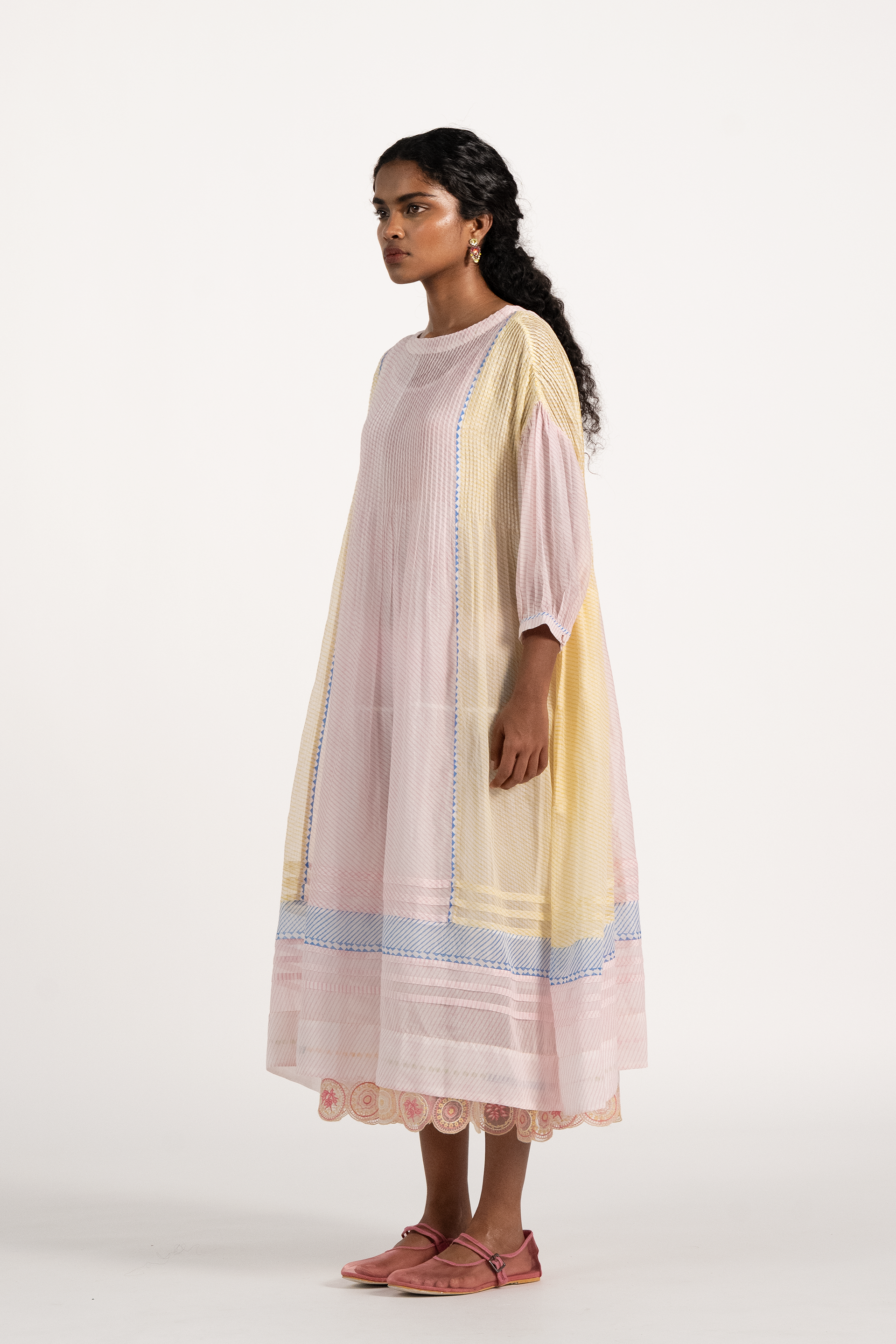 Pintucked relaxed midi summer dress in hand blocked fine stripes print. Comes with a complimentary plain lining, without any trims details.