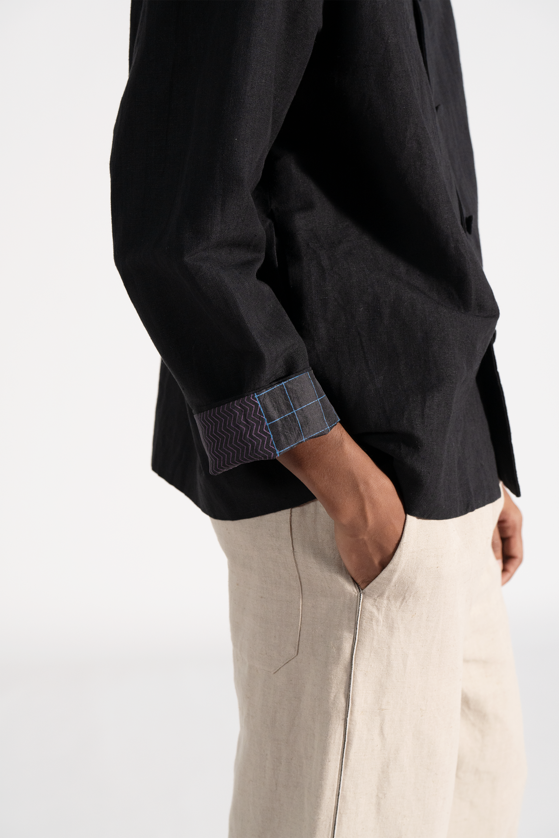Stand collar relaxed fit button down jacket with side seam pockets in cotton linen fabric comes with an attached hand block print silk lining.