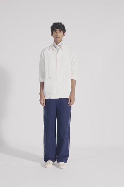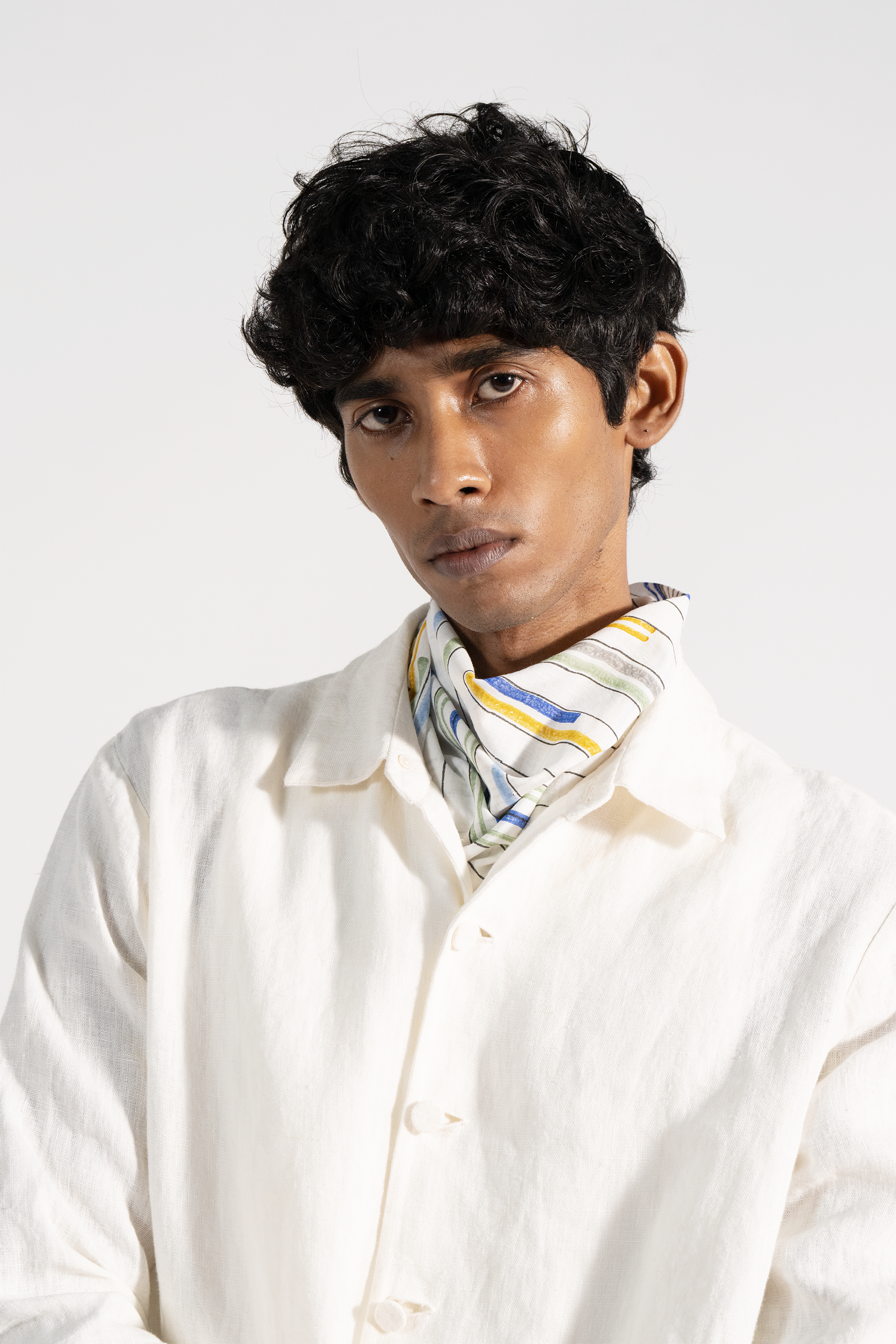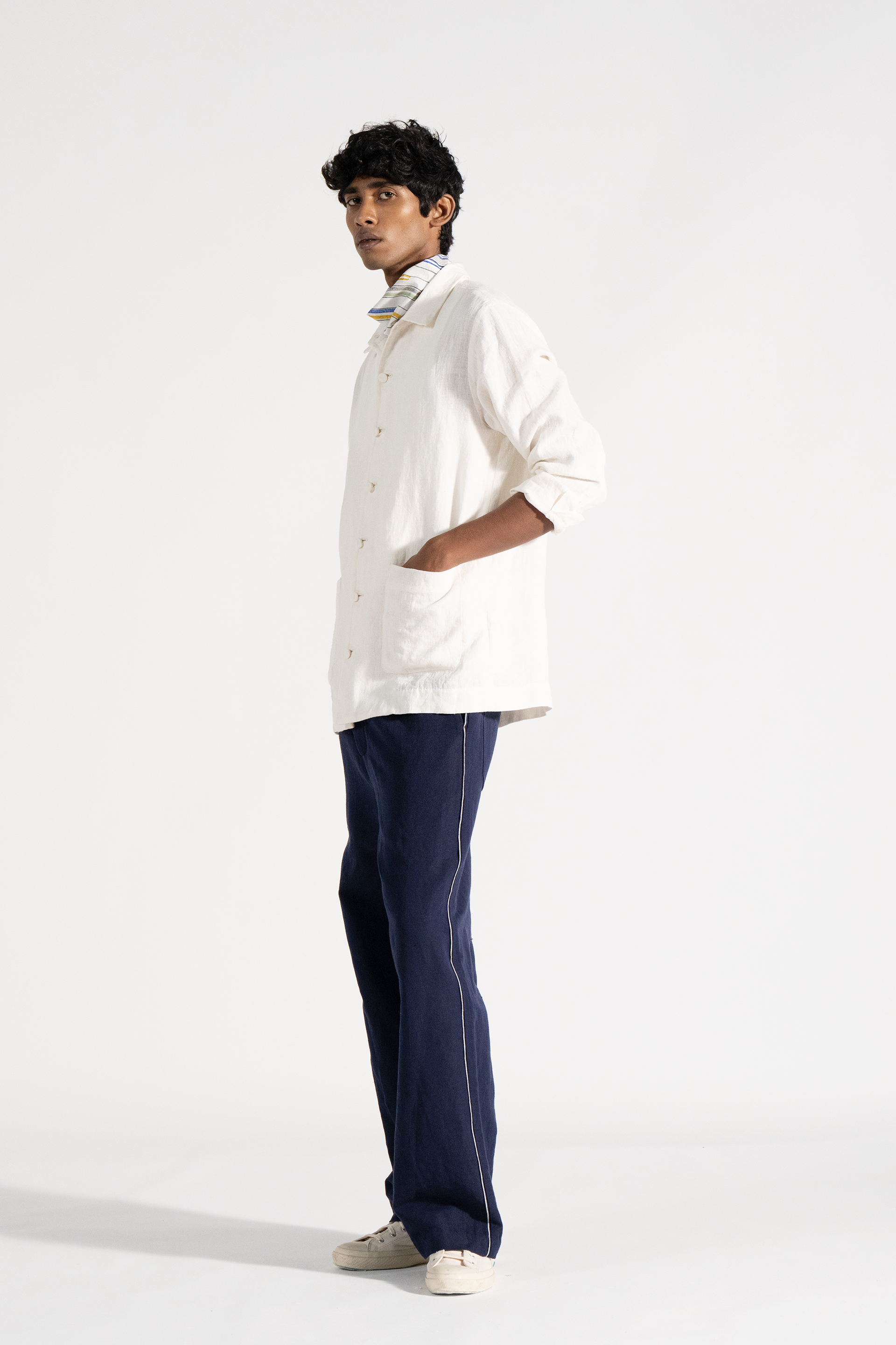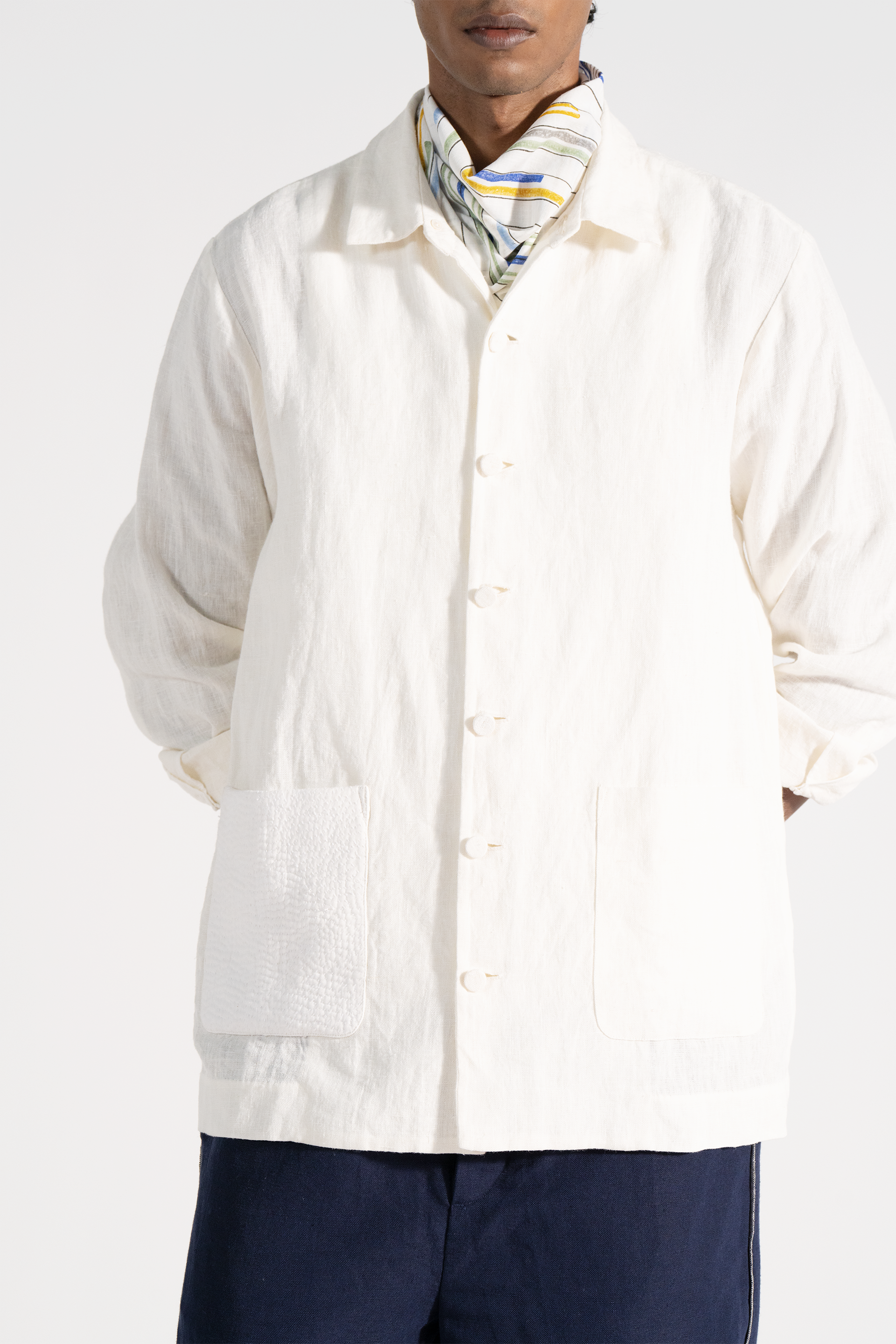 Solid ecru jacket with kantha embroidered pocket in 100% linen fabric.