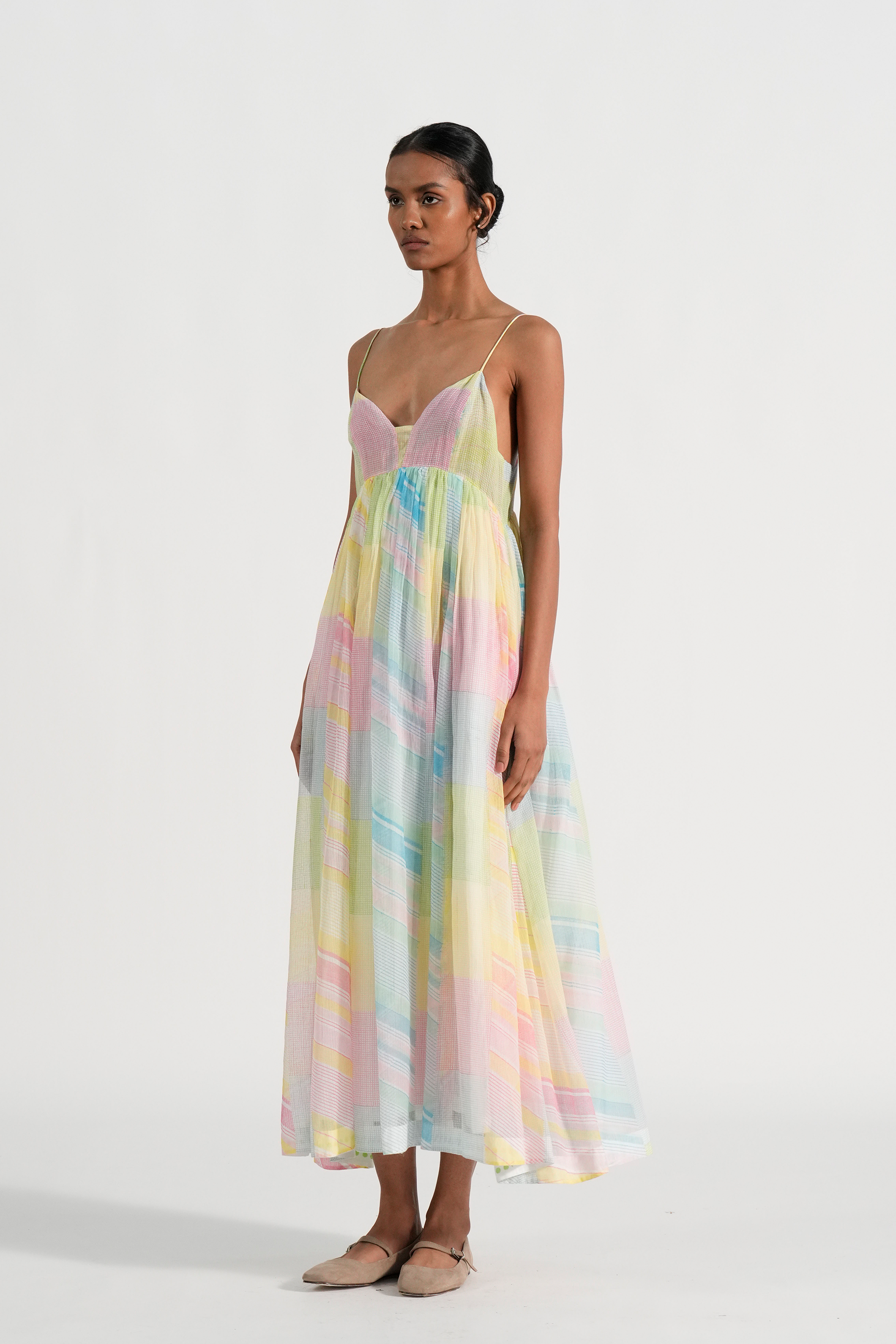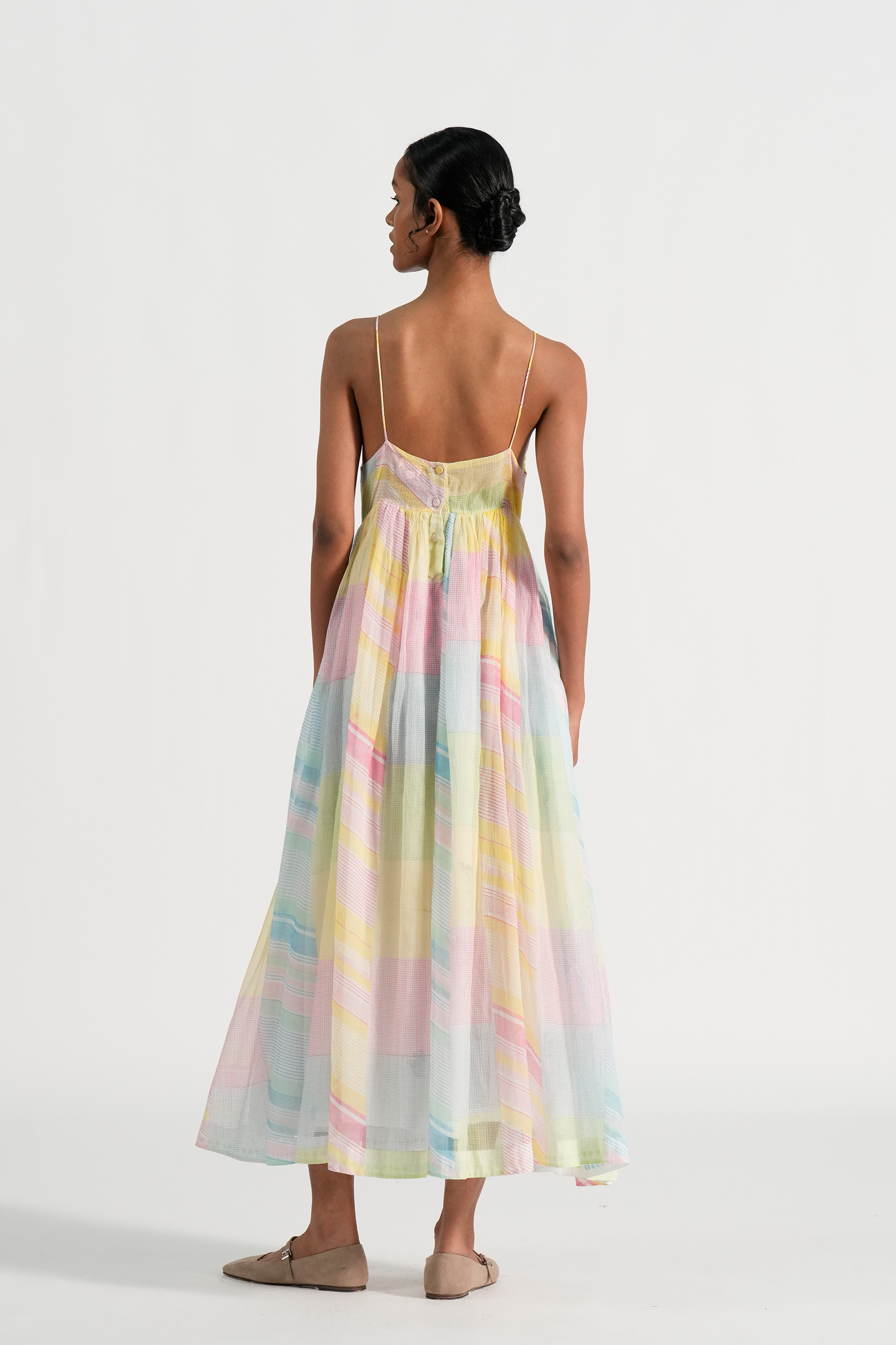Midi length strappy dress in hand block printed multicolor collage print.lined in cotton.