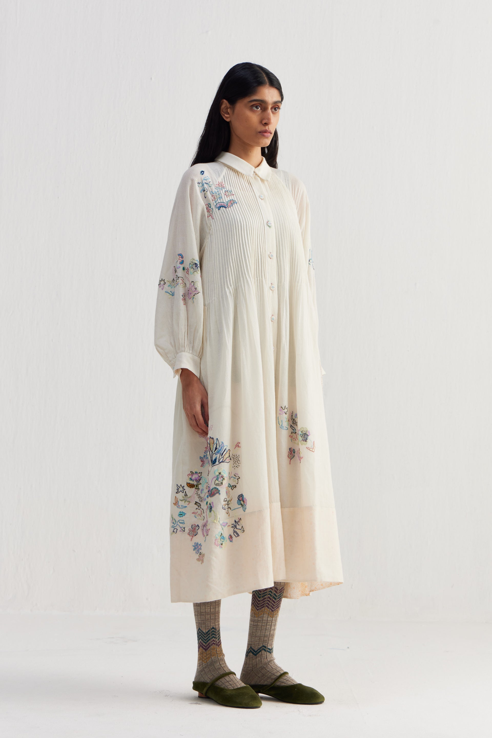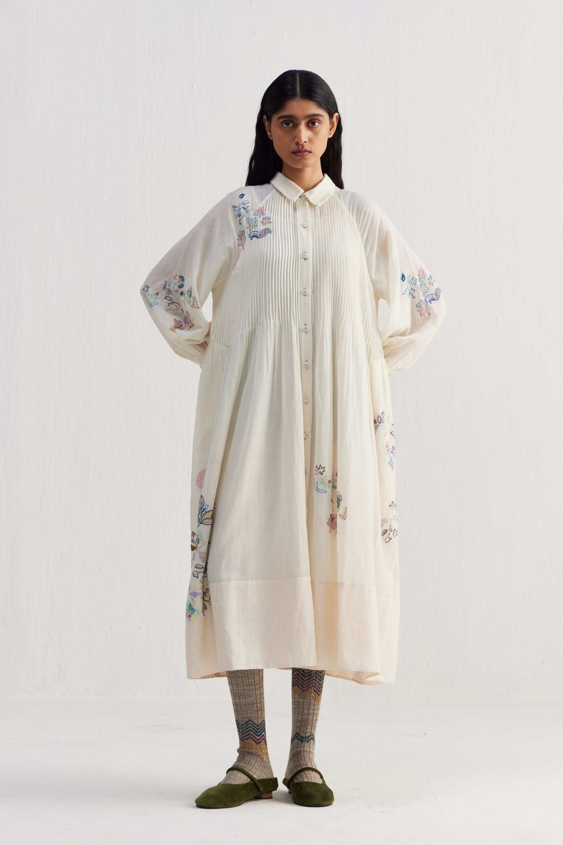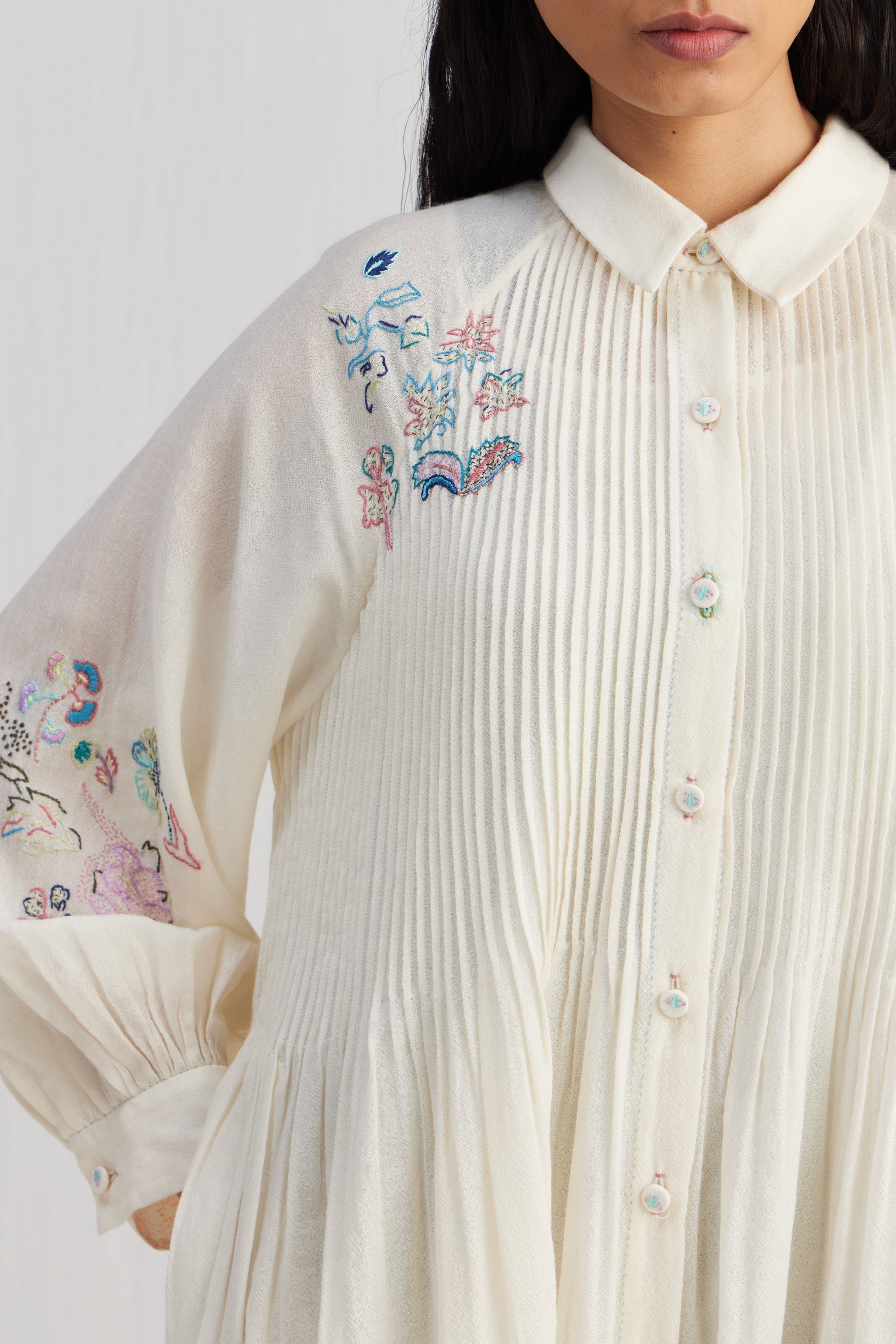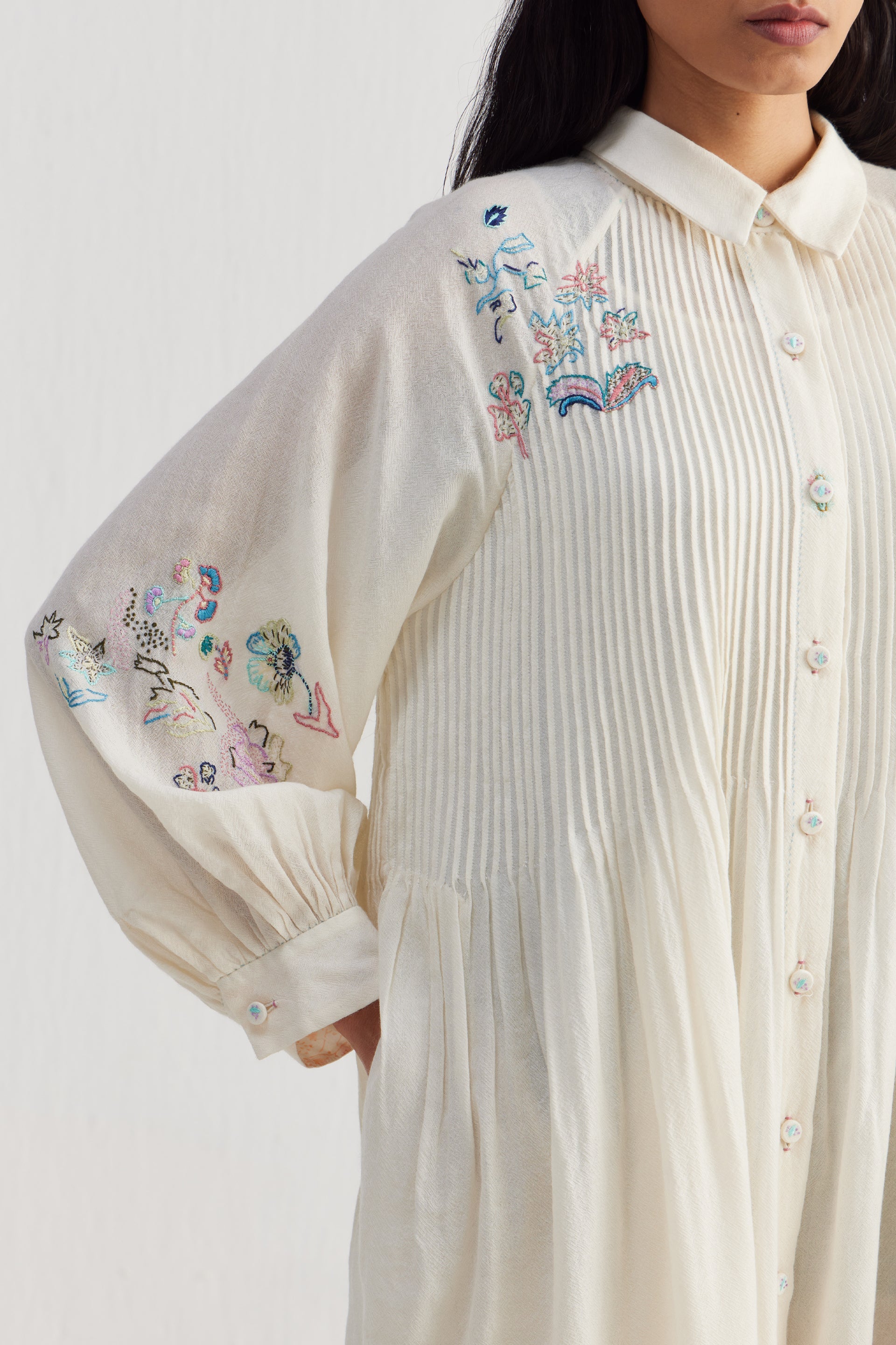 Relaxed fit front open button down collar midi dress with full puff raglan sleeves, pintucks allover the bodice and finished with handblock print 100% silk fabric facing detail at hem. Constructed in solid 100% merino wool with placement intricate sozni hand embroidery. Finished with contrast handblock print 100% silk fabric piping and facing detail.