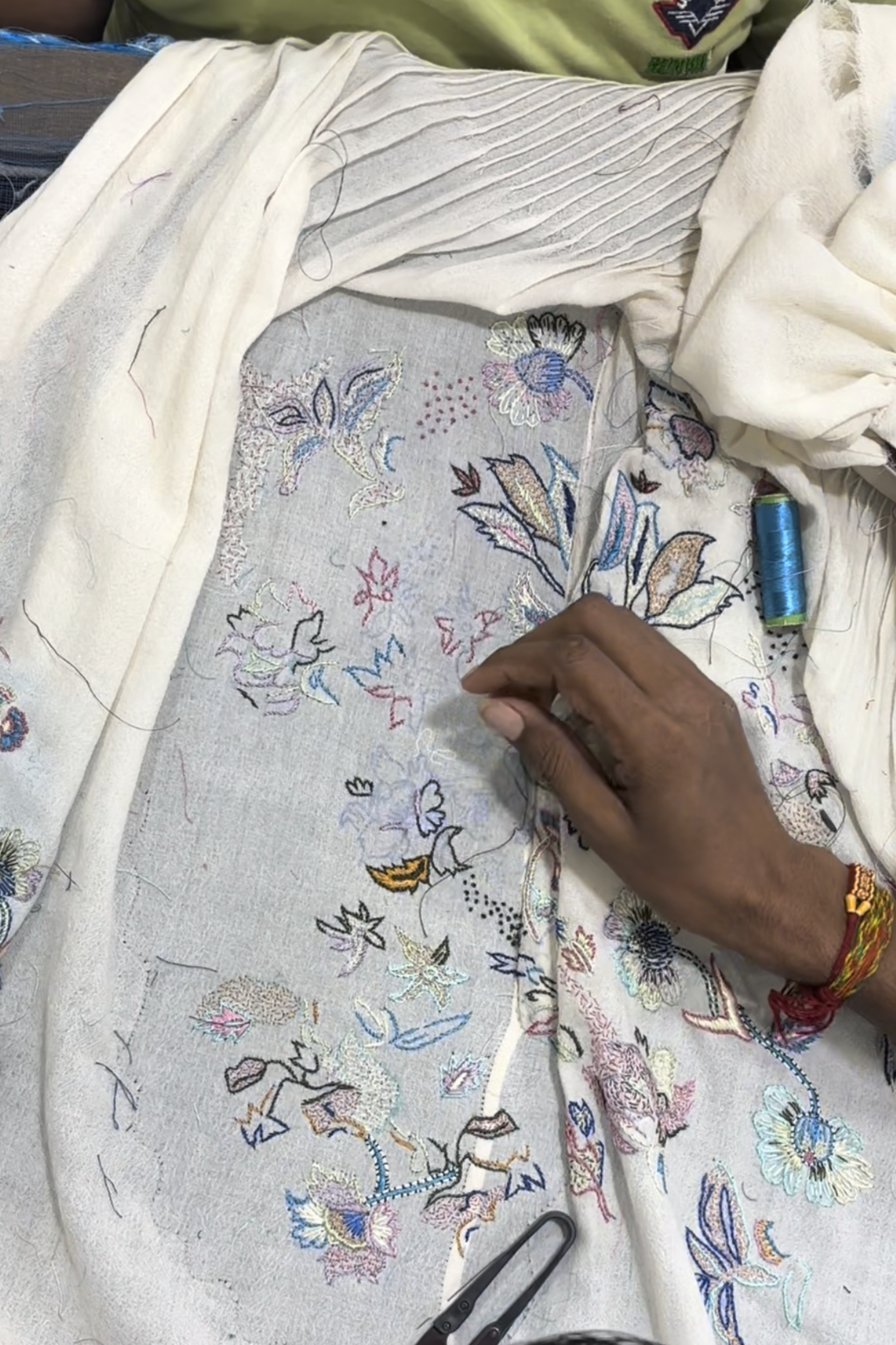 Sozni embroidery—is a 500 year old needle craft embroidery passed down through generations. Each piece reimagines traditional motifs with delicate chain stitches in silk and wool threads. Originally sozni was done in Kashmir on pashmina wool shawls in silk threads. We’ve used the dexterity and elegance of sozni and contemporised it in patterns, colors, and stitch variations.