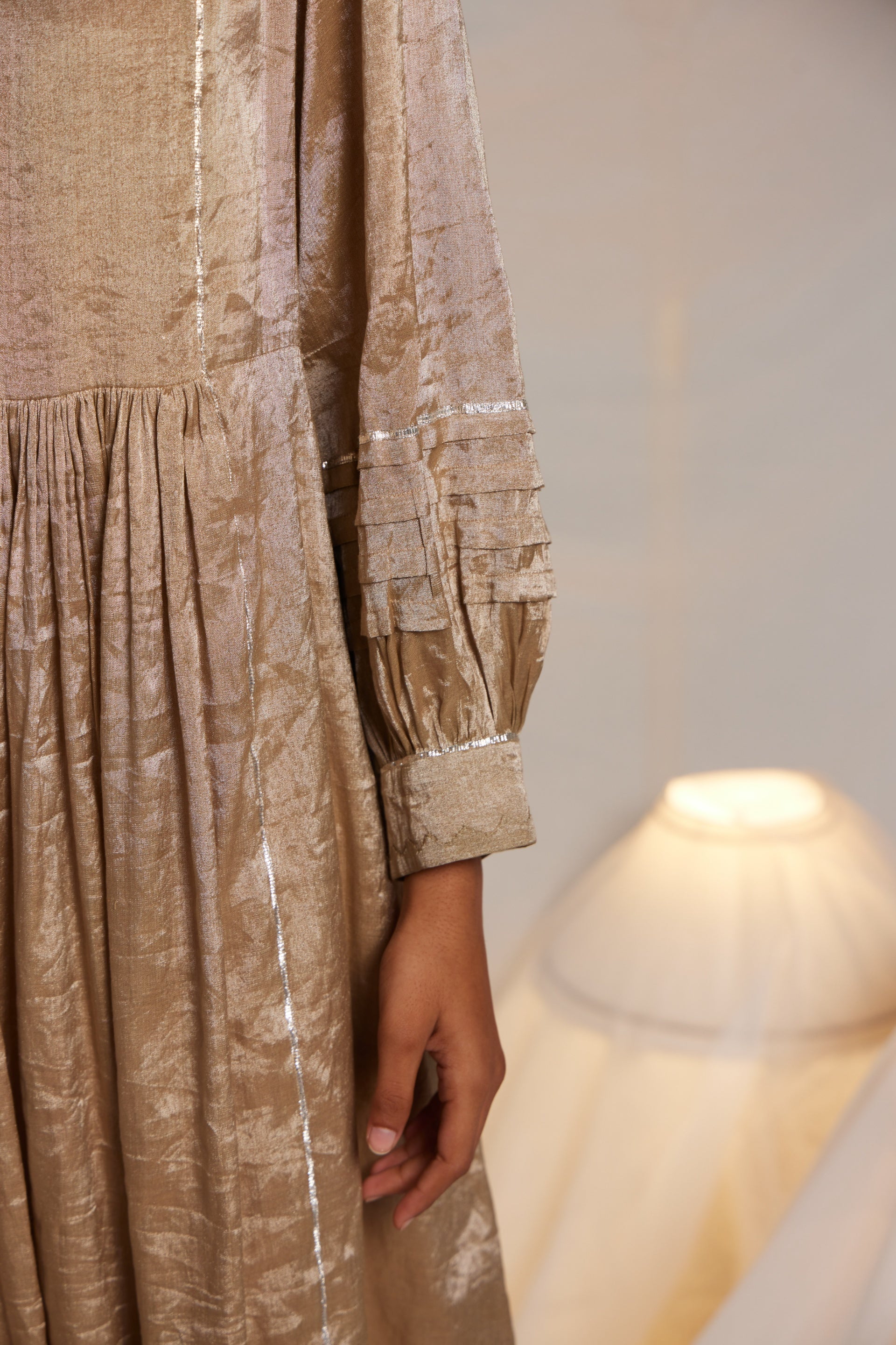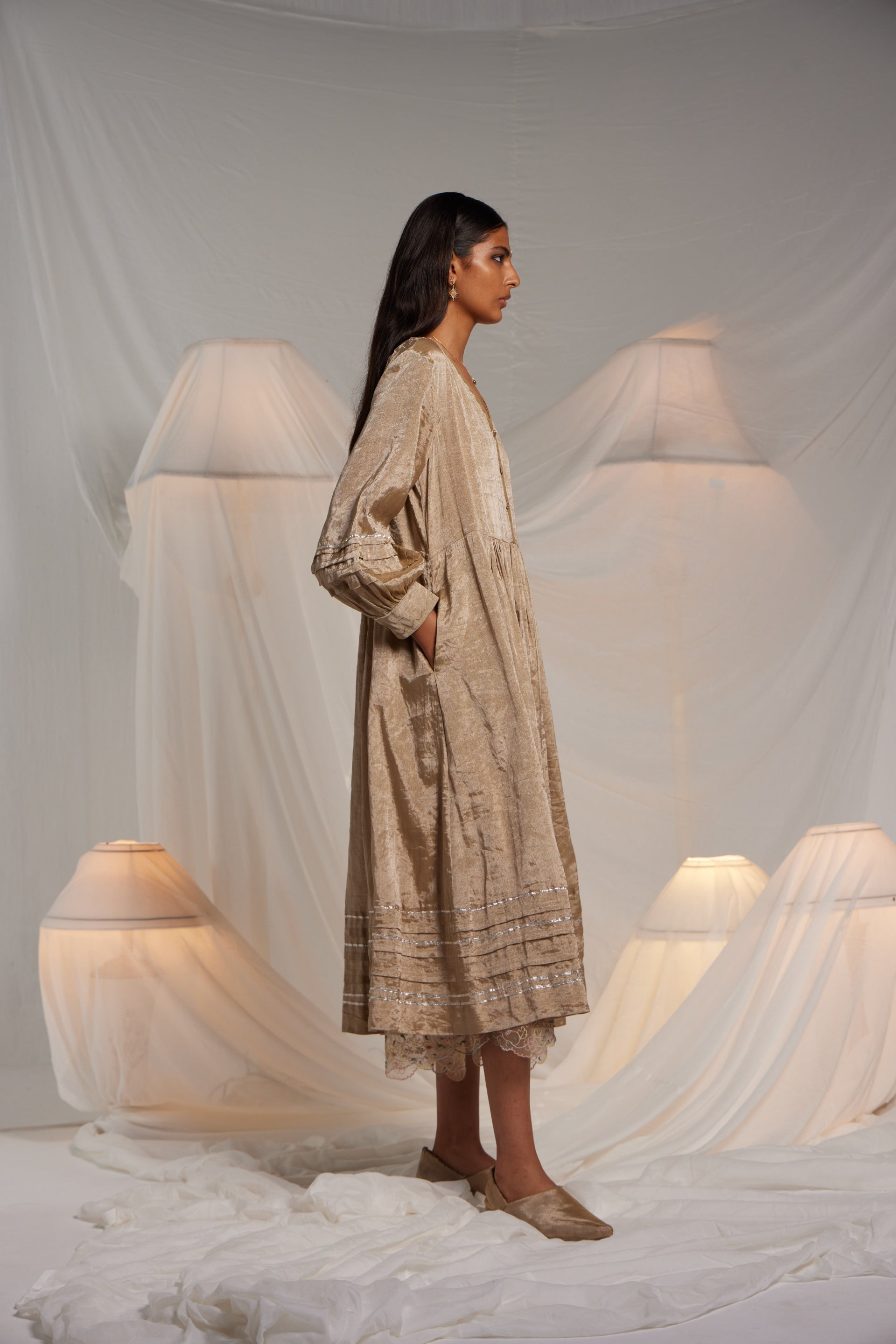 Midi Length Dress With An Exquisite Chevron Hand Applique On The Front Neckline And Cuff Edges. Metallic Gota Finish The Piece Through Out In Seams, Sleeves And Hem. Comes Along With A Separate Linen Zari Tissue Pant With Side Seam In Gota Detail.