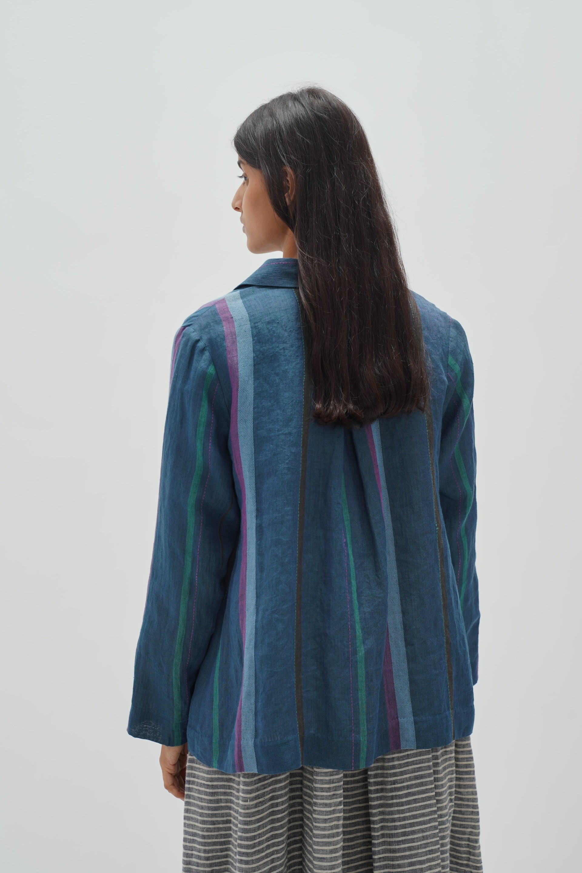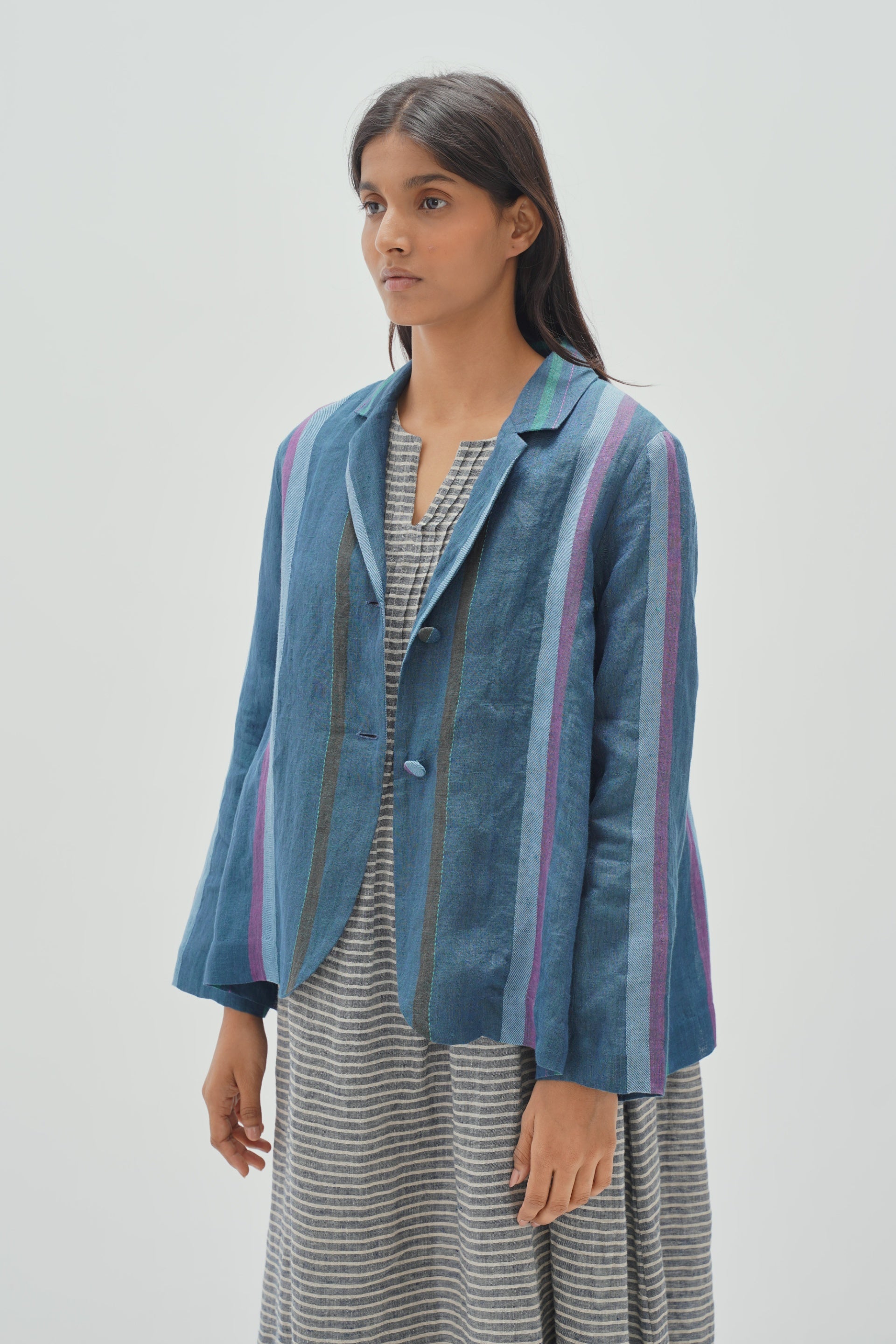 Short blazer with contrast stripes detail in multi-weaves. Comes with an attached hand block printed cotton lining.
