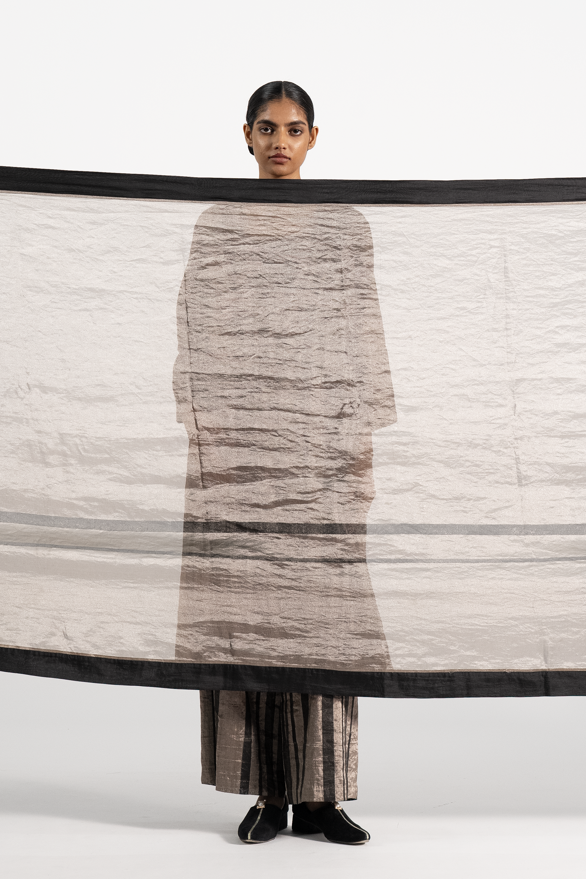 Striped Silk Organza Tissue Dupatta With A Black Silk Border And Binding Detail.