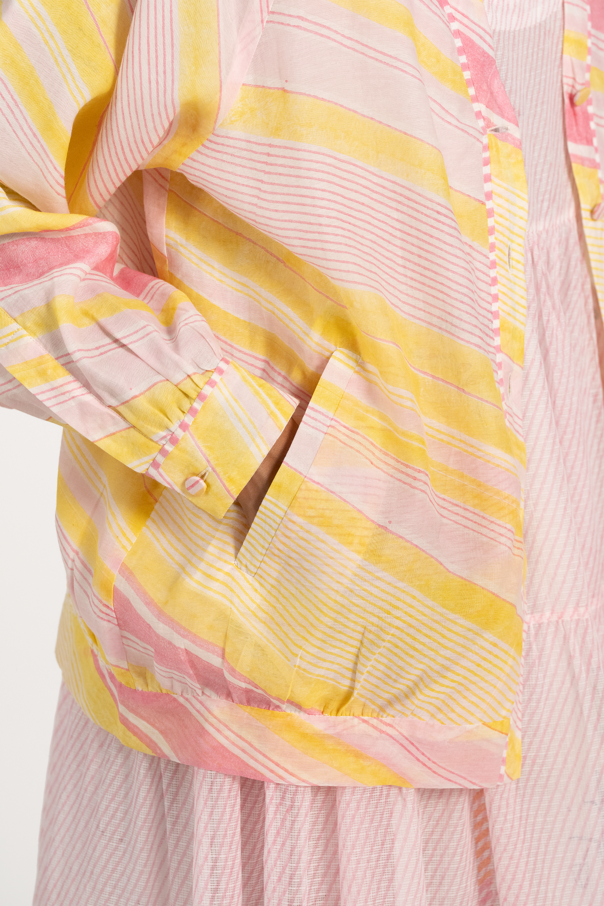 Short bomber jacket in handblock printed multicolor, stripes and contrast binding detail, lined in cotton.